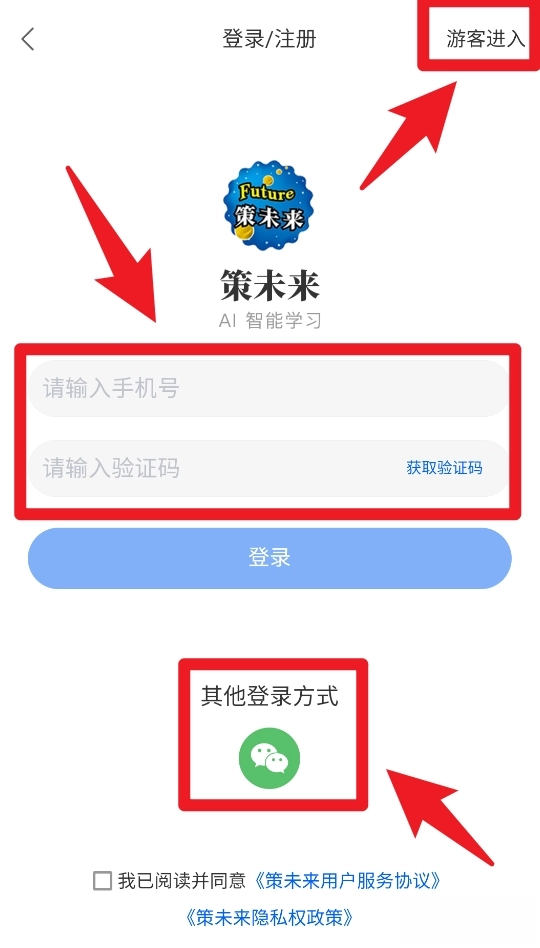 1、在登录页面,用户可以输入手机号码并获取验证码快速登录,也可点击右上角的“游客进入”免注册使用,或选择微信登录方式更加便捷。