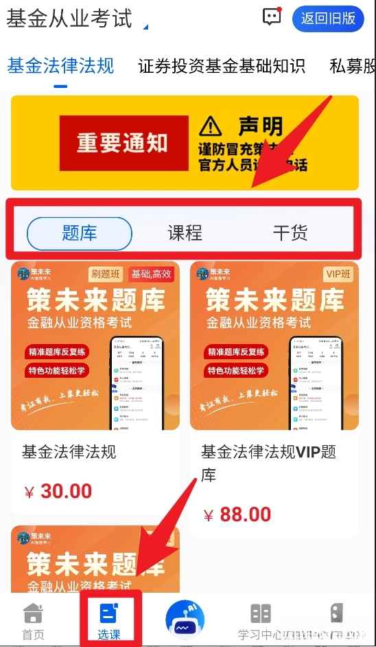 3、点击底部“选课”按钮进入选课页面,可在“题库”、“课程”、“干货”三大分类中选择购买需要的学习资料,实现内容个性化配置。