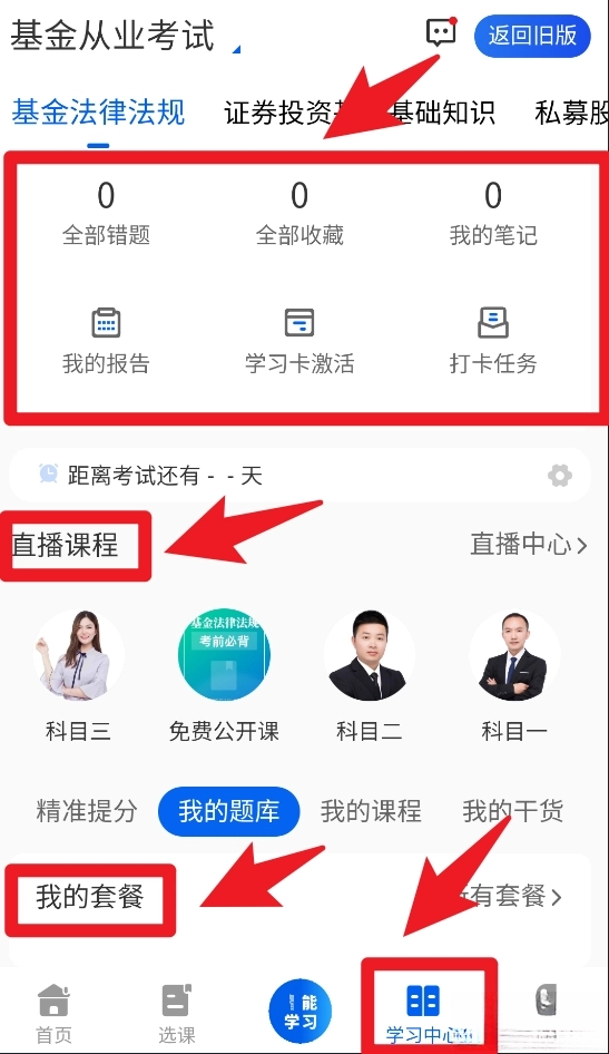 4、在“学习中心”页面中可查看错题、收藏、学习报告等数据,还可进入直播课程或我的套餐,全面管理学习进度。