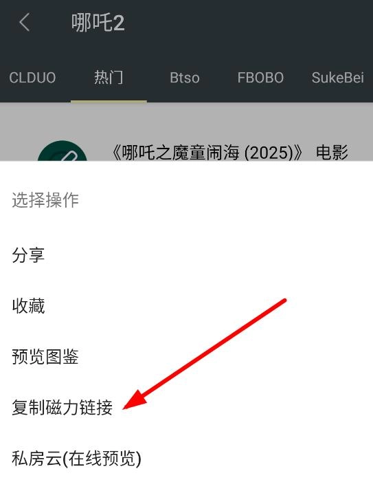 点击链接图标后会弹出选项,选择“复制磁力链接”并将其粘贴到下载器中即可开始下载。