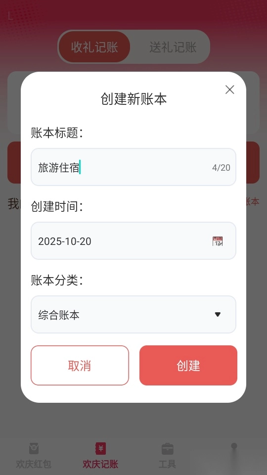 4.在“创建新账本”的弹窗页面中,依次填写账本标题、选定创建时间并选择账本分类,随后点击“创建”按钮即可进入下一操作环节。
