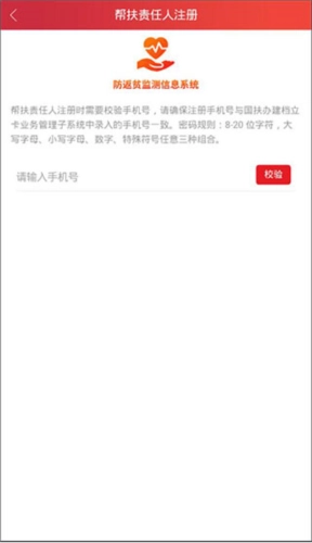 在帮扶责任人页面,需先校验手机号,待确认注册手机号与国扶办建档立卡业务管理子系统中录入的手机号一致后,遵循指引操作即可完成注册。