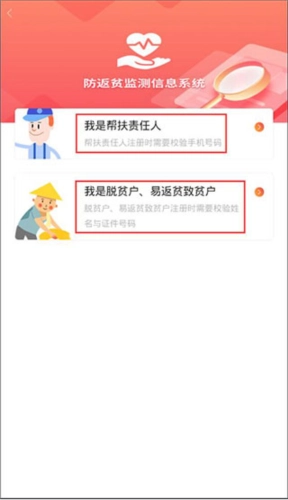 进入注册界面后,这里分为帮扶责任人和脱贫户、易返贫致贫户两个部分,我们可依据自身身份进行对应选择。
