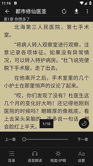 还有护眼模式,可调节阅读界面的亮度和色温,保护用户的视力健康,可以享受真正的精品小说尽情的阅读。