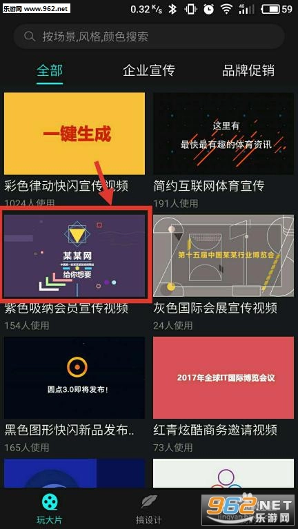页面设有“全部”“企业宣传”“品牌促销”等视频模板分类,可直接点击应用。