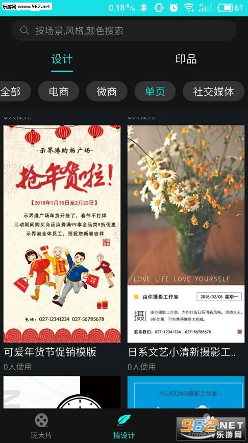 点击底部菜单栏,切换到“搞设计”板块,所有平面设计所需的模板都会在这里呈现,主要包含“线上设计”和“线下印刷”这两个类别。