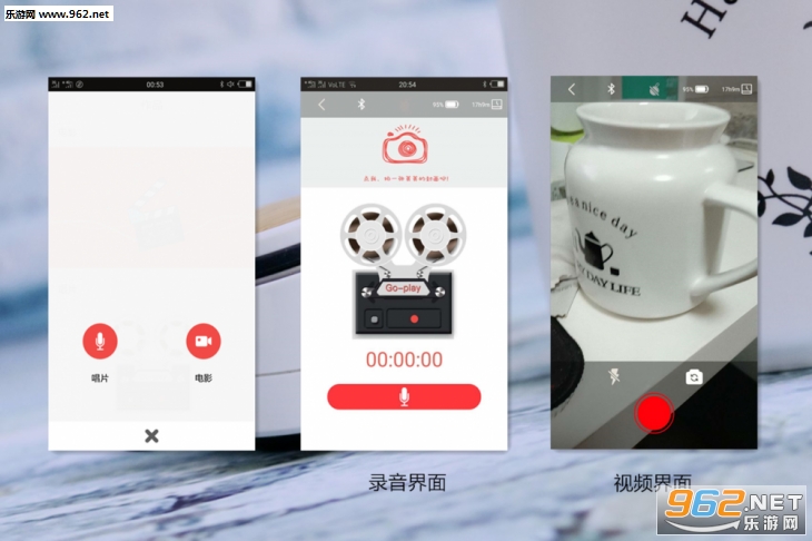 拍摄机界面设有唱片和电影两个录制选项,无论使用哪个功能,顶端都能显示录音器当前的电量与续航信息。唱片界面分为两部分:上方“相机”区域是封面图位置,下方为录音界面,点击话筒可开始录音,再次点击则停止。电影机界面相对简单,与普通手机摄像界面基本一致。