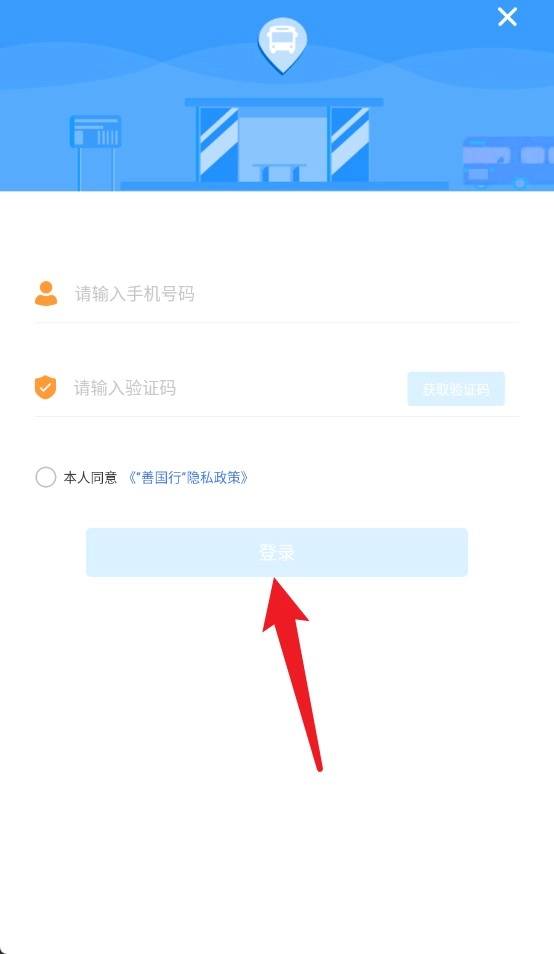 首次登录善国行时,需输入手机号与验证码,同时勾选同意隐私政策,之后点击登录按钮即可完成验证。
