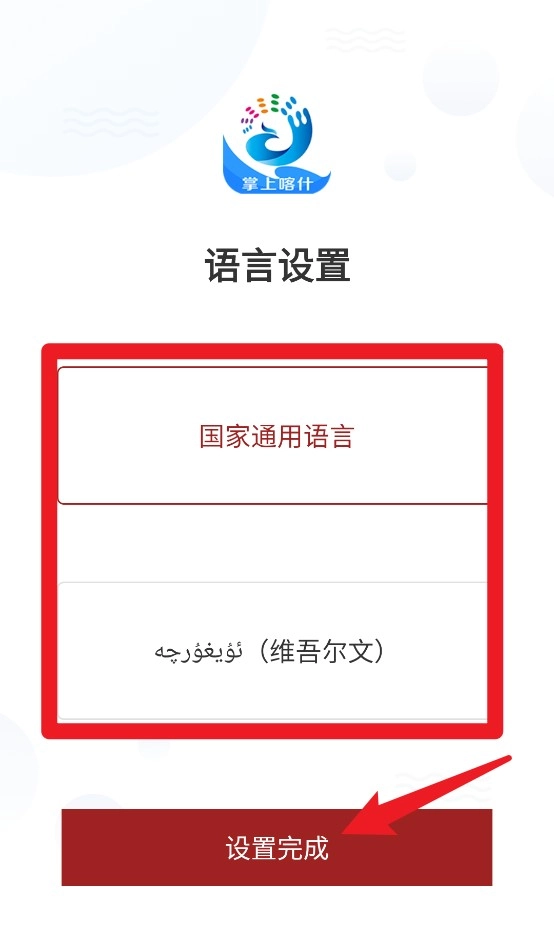 进入掌上啥什应用后,你可以选择国家通用语言或者维语,完成语言设置这一步骤后,点击对应的按钮进行确认即可。