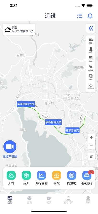 这是昆明路网监控平台,能够对路面实施实时监控,便于我们掌握车流量状况、隧道内部情况等,还可以及时为我们提供路况、温度、湿度以及道路结冰等方面的数据。
