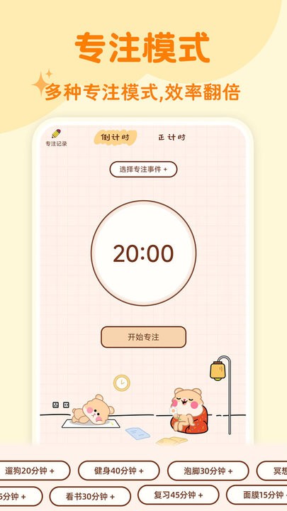 4、专注时钟:提供倒计时和正计时选项,计时结束提醒,每一次的专注计时都有记录,让你沉浸式工作\\学习\\生活。