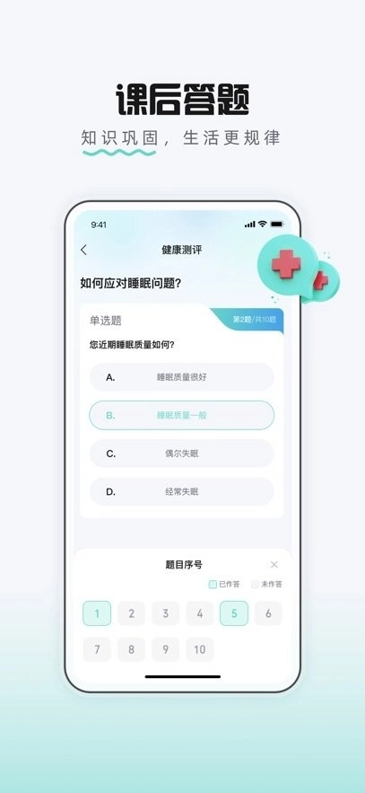 这是一款提供精品课程的在线教育软件,用户可以收藏感兴趣的资讯或课程,方便有需要时快速查找、阅读和学习。完成课程后,还能参与答题小测验,助力巩固刚学到的健康知识。
