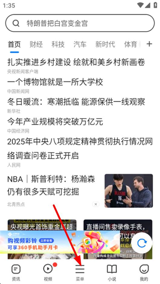 在360浏览器抢票版的首页,点击底部导航栏中的菜单选项,就能展开功能菜单页面。