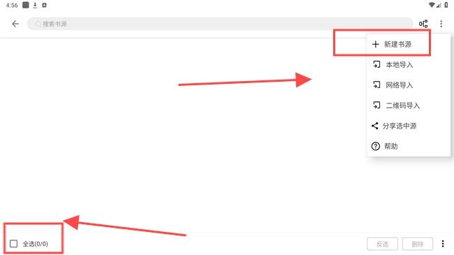 在书源管理界面里,既可以直接勾选已有的书源,也能够选择【新建书源】来手动导入书源。