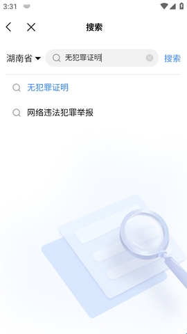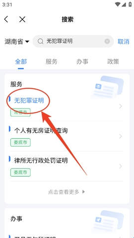 接着在搜索框中输入“无犯罪证明”,等搜索结果出来后点击进入。