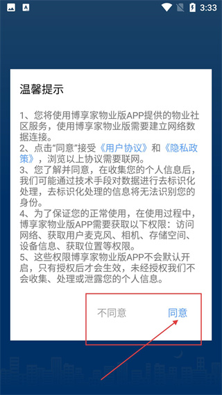 打开应用后会弹出【温馨提示】弹窗,点击【同意】按钮即可进入登录界面,这款应用是物业社区服务类工具。