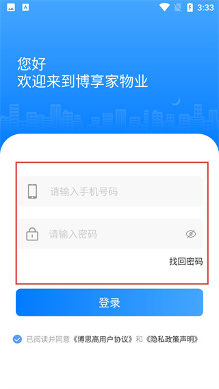 在登录界面填写手机号码和密码后,点击【登录】按钮,就能进入应用使用各类物业相关服务;要是记不起密码,可通过点击【找回密码】选项来重置密码。
