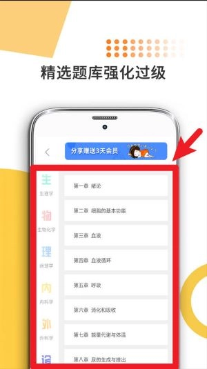 点击章节列表里的任意一项就能进入对应的题库模块,每章的题目都是依据考试大纲标准精心编写和整理的。