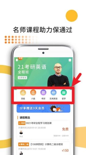 进入“考研英语”课程页面后,可依据自身学习需求,从四级、六级、考研、实用英语及留学课程等分类中选择对应板块进行学习。