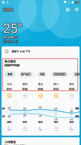 2、在主页往下拉就是刷新,主页上的信息非常齐全,“每日概览”点开就是15日的预报数据,每日概览下面是“小时概览”、“空气质量”、“日月升落”、“详细数据”;