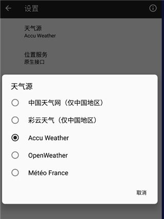 3、点击右上角的设置图标,它支持提供多项自定义设置,比如推送降水预报、自动刷新频率、颜色模式、动态壁纸、切换天气数据等;
