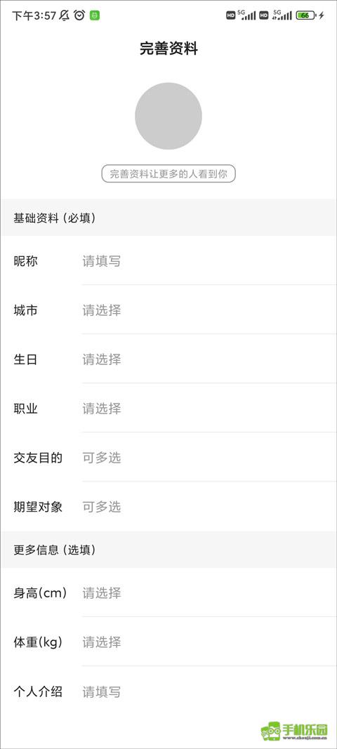 2、之后你需要完成资料的填写,像头像、昵称、城市、交友目的等等