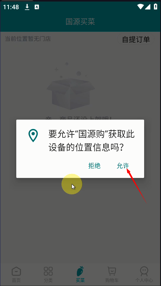 2、需要注意的是,使用买菜功能需要获取您的当前地理位置,请点击“允许”按钮。