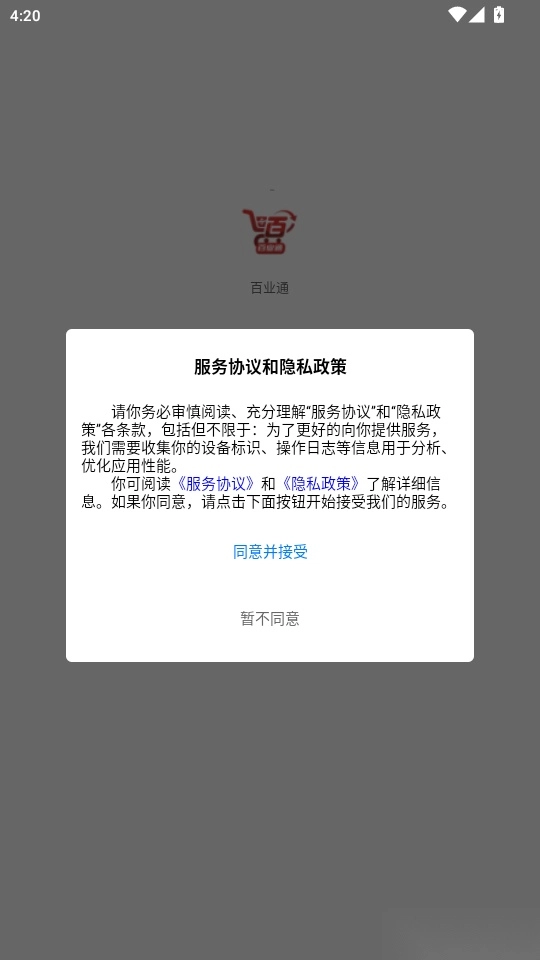 1. 启动软件后阅读“服务协议与隐私政策”,点击“同意并接受”按钮进入下一步。