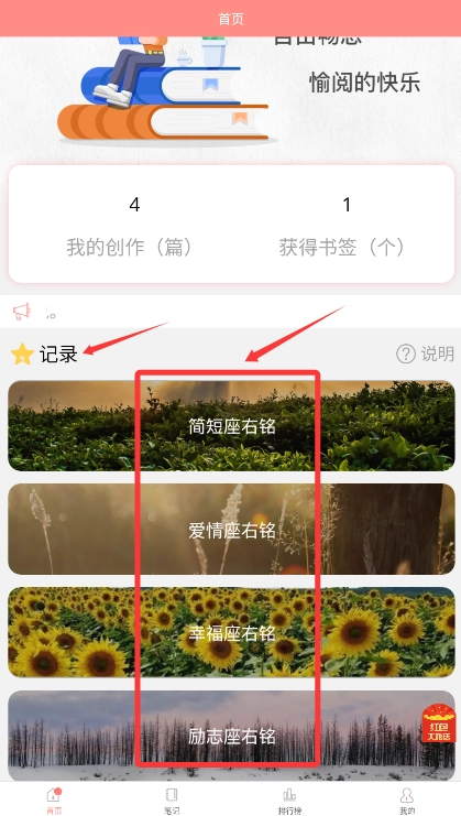 主界面的记录板块,呈现着简短、爱情、幸福、励志等各类精选座右铭的分类。
