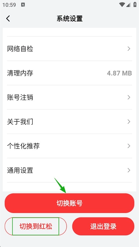 5、在系统设置页面的下方找到“切换到红松”选项;如果您需要更换微信号登录,需先点击退出登录,再使用新的微信账号扫码完成登录操作。