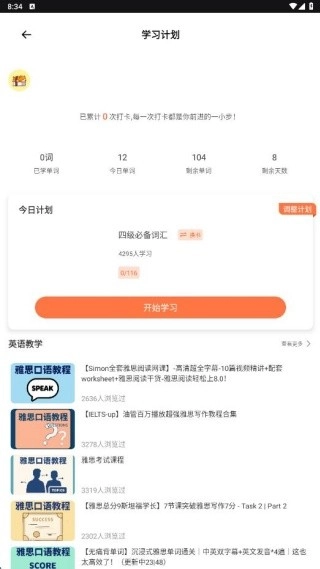 2、进入单词打卡页面,展示了你的单词学习计划。