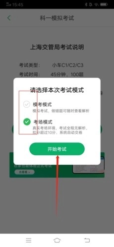 3、提供模考模式与考场模式两种考试模式供选择,选定后再次点击“开始考试”即可。