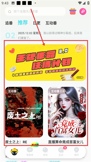 1、在推荐页点感兴趣的作品封面能进入阅读页,后续可体验该互动番的剧情内容啦。