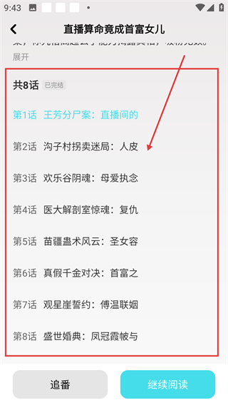3、在作品的话数列表页,能看到全8话的内容,选对应话数就能跳转阅读,还能点追番收藏作品呢。