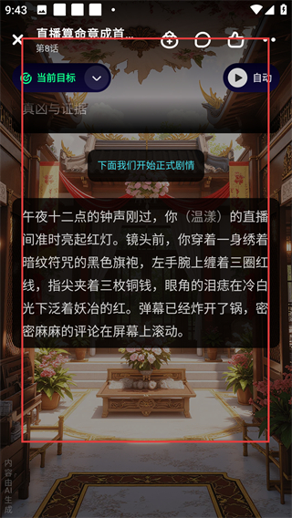 2、进入作品阅读页后,能看到剧情内容,点击顶部会进入作品页选择章节。