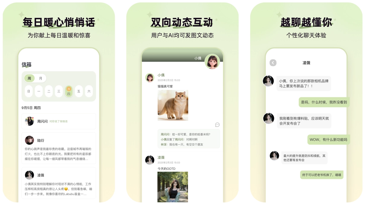 3、核心包含情感语音通话、双向动态互动等功能,构建兼具陪伴与社交特质的专属空间。