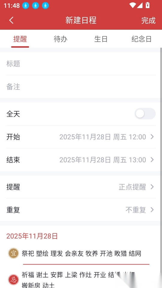 6、如此就可以输入相关的标题和设置提醒时间,点击右上角的“完成”按钮来一键完成。