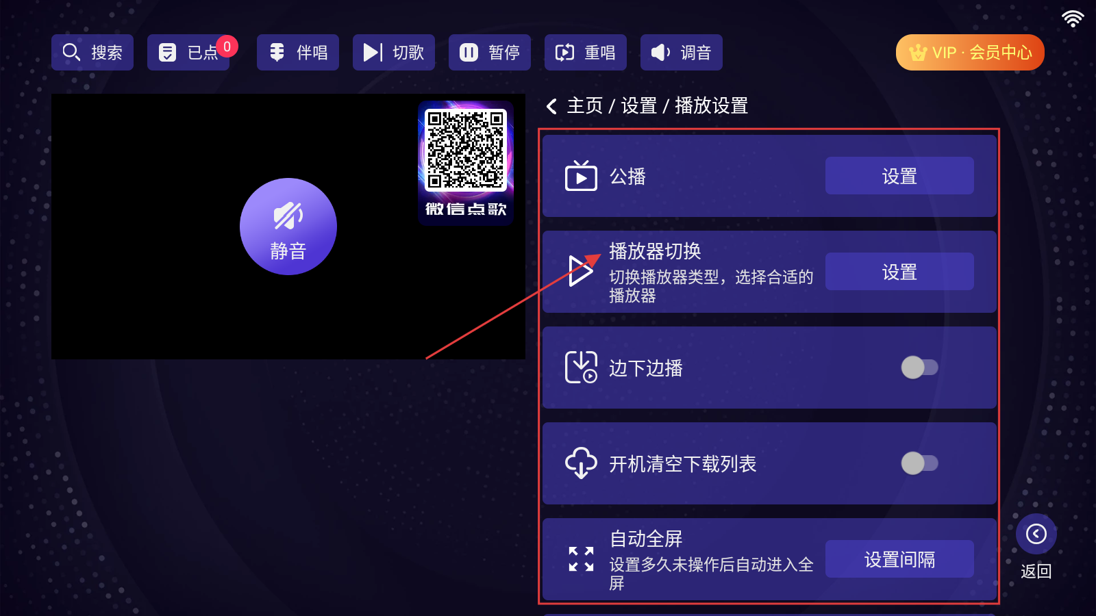 3、进入【播放设置】页面后,能够对公播、播放器切换、边下边播等功能进行设置,从而完成播放相关的设置流程。
