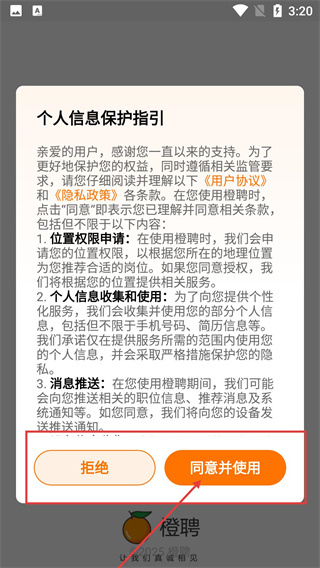 当橙聘应用启动后,您需要先阅读个人信息保护指引,随后点击“同意并使用”按钮,即可进入应用的使用流程。