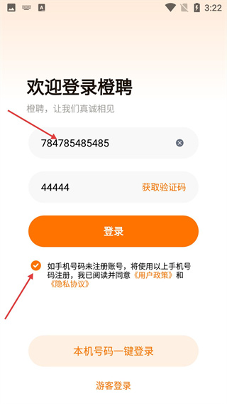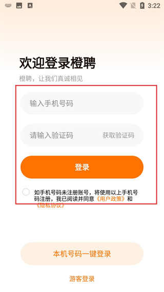 进入橙聘登录页面后,有三种登录方式可供选择:一是输入手机号码并填写验证码进行登录;二是使用本机号码一键登录;三是选择游客登录模式。