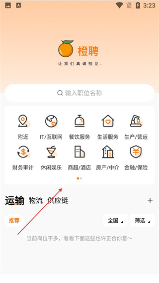 登录后进入橙聘首页,您可以借助搜索框输入职位名称来查找岗位,也能通过“附近”“IT/互联网”这类分类,快速筛选出符合需求的职位。