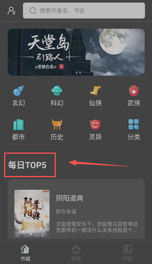 1、最快捷的找书方法是在顶部搜索框输入书名或作者名,如果还没有具体目标,可以向下滑动查看分类标签,包括武侠、玄幻、科幻等。