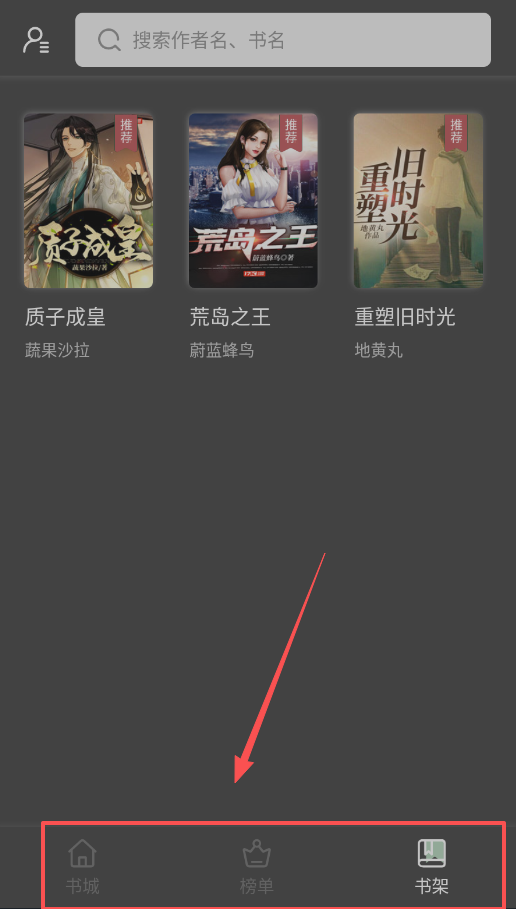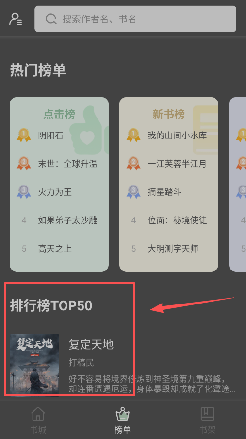4、软件界面底部固定显示书城、榜单、书架三个导航按钮,找书时可以先浏览书城的分类推荐,再参考榜单的热度排名。