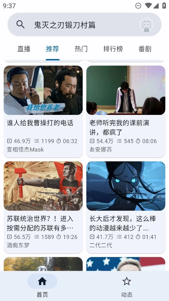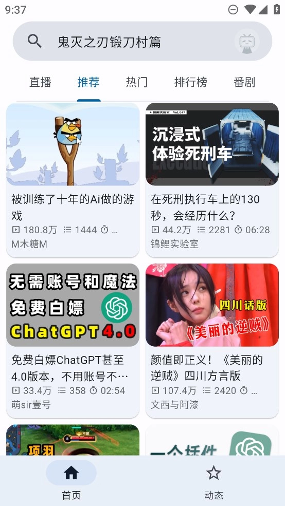 这个界面比哔哩哔哩更简洁,主要专注于视频和直播内容的播放,用户可以自由地刷看。