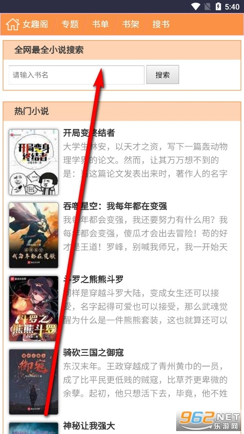 在安装女趣阁小说最新版本v2后,首页上方会出现一个搜索区域栏目。