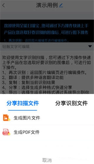 点击“分享”后,选择“分享扫描文件”,可将扫描文件导出为图片或PDF格式;若点击“分享识别文件”,则能选择导出为TXT、PDF或Word文件。