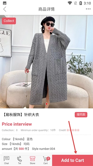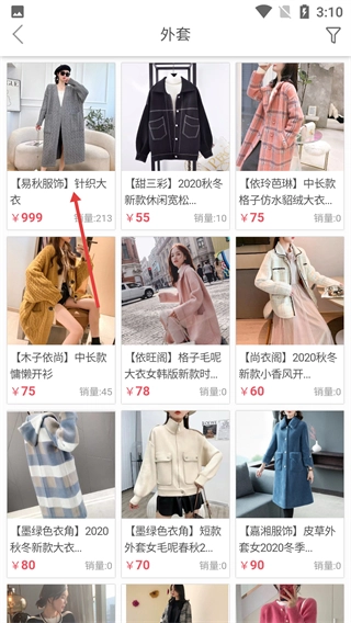 3、在外套商品列表页面,点击【【易秋服饰】针织大衣】这一条目,就能进入对应的商品详情页面。