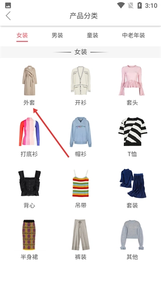 2、在【产品分类】页面,点击【外套】选项即可进入外套商品列表页面。