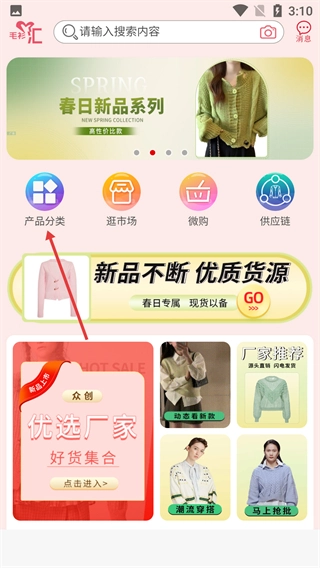 1、在应用首页,点击【产品分类】选项即可进入产品分类页面。