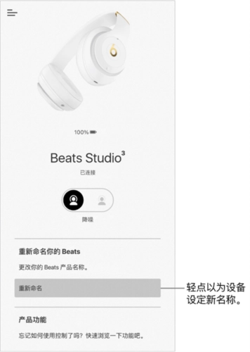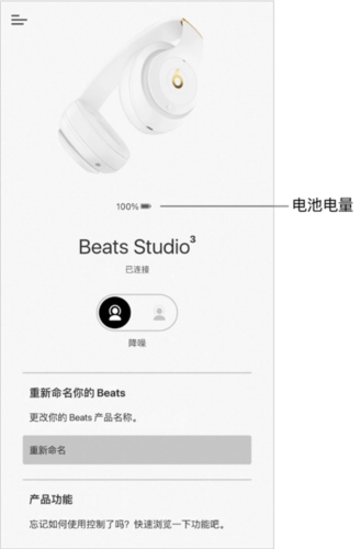 打开beats可以查看设备的电池电量,也能更改设备名称,还能调整其他设置。